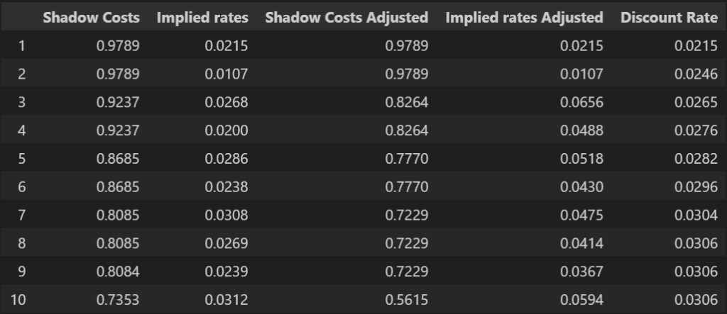 Also, in addition to the optimization result itself, there is another interesting result that come naturally with the optimization – the so-called shadowed cost. This is defined as what is the increase in the objective (cost for purchasing bond) with an additional unit increase in each of the constraint (liability cashflow). In this optimization problem, it naturally interesting because this can be compared to the implied zero-coupon bond price / discount rate from the bond portfolio, as price of the additional unit increase in time t at time 0 is naturally a ZCB maturing at time t.
