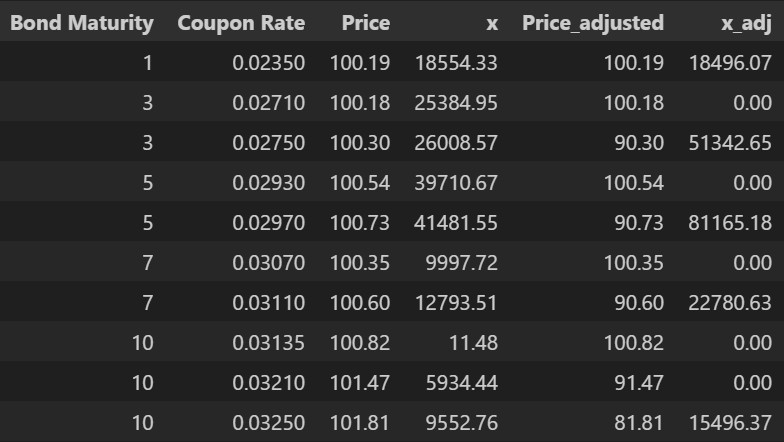 From the result, while for the first set of bond prices, the optimizer allocates more or less evenly across the bonds with the same maturity as they are equivalent and optimizer cannot distinguish them too much, for the second set the optimizer does allocate to the bond with highest yield as expected.